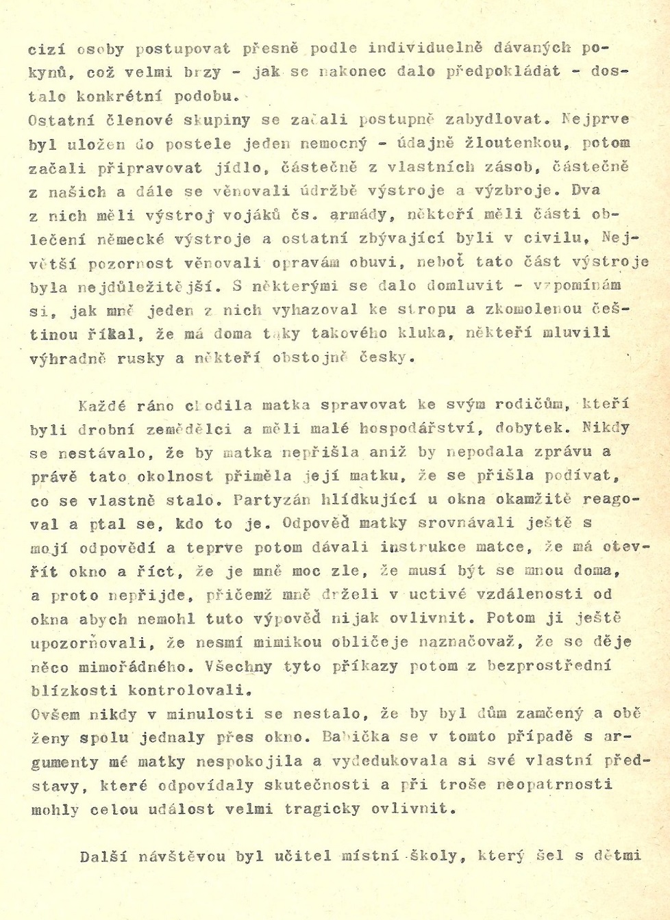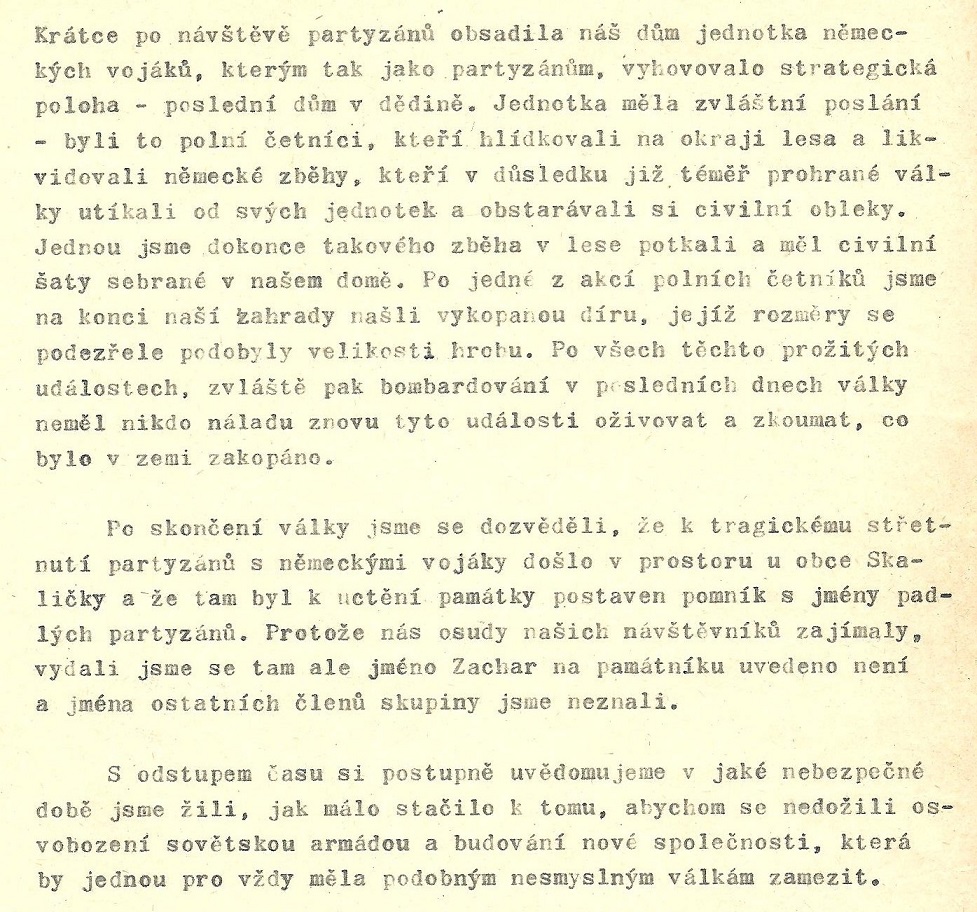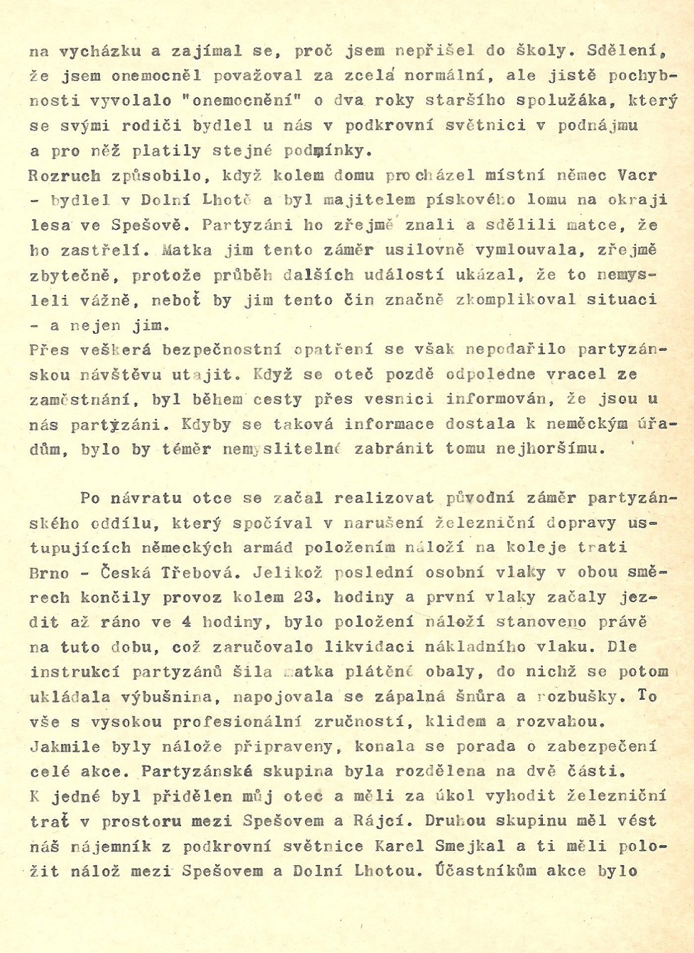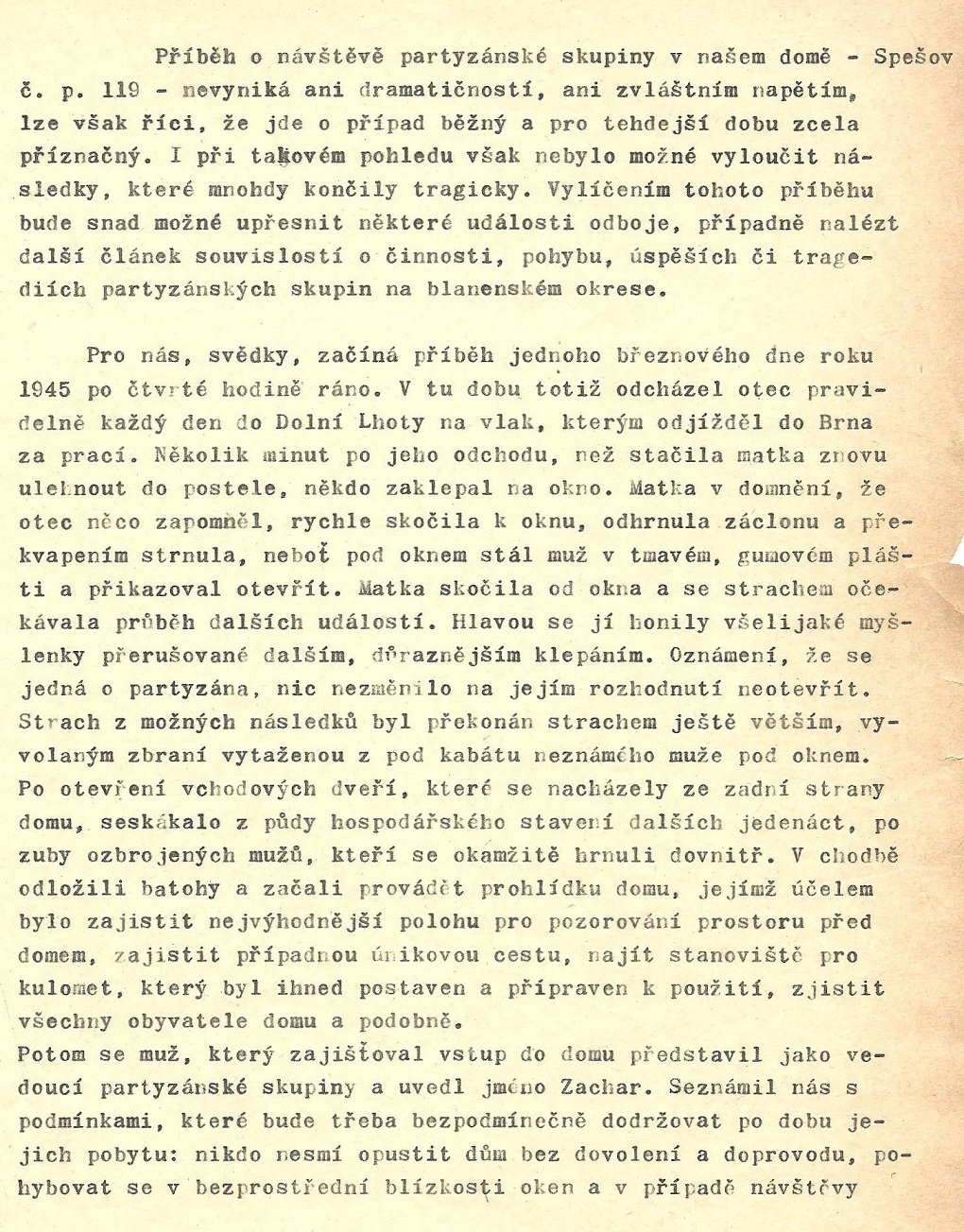 Zápis pana Milana Bedana z cca 80. let o pobytu a akci partyzánů ve Spešově v roce 1945.
