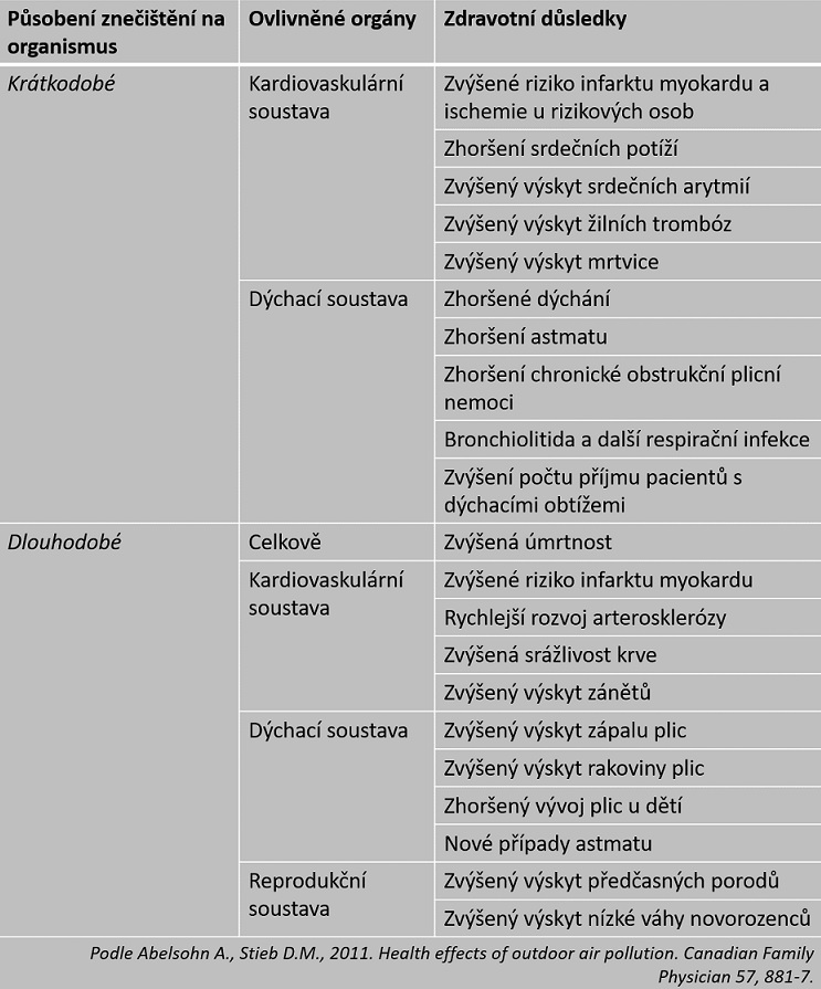 Na prachové částice jsou vázány nebezpečné látky, např. těžké kovy (HMs) a také tzv. polycyklické aromáty (PAU). Z nich nejznámější je benzo(a)pyren (BaP), který prokazatelně u člověka způsobuje rakovinu. V polétavém prachu dále najdeme i skupinu látek, kterým se zkráceně říká dioxiny (PCDD/Fs) a jež vznikají při jakémkoli spalovacím procesu. Některé z nich patří mezi nejjedovatější látky, se kterými se člověk může setkat. Zákonem stanovené imisní limity pro ochranu zdraví lidí jsou u prachových částic a benzo(a)pyrenu na řadě míst České republiky překračovány. Pro řadu škodlivin (např. dioxiny) však limity ani stanoveny nejsou. V malých obcích je problém zejména lokální vytápění, ve městech se na špatném stavu ovzduší podílí i doprava, v průmyslových oblastech průmysl a vliv má i zemědělství. V tabulce níže jsou shrnuté vlivy znečištění ovzduší na lidský organismus.